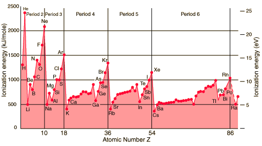Ionization Energies![]() The ionization energy or ionization potential is the energy necessary to remove an electron from the neutral atom. It is a minimum for the alkali metals which have a single electron outside a closed shell. It generally increases across a row on the periodic maximum for the noble gases which have closed shells. For example, sodium requires only 496 kJ/mol or 5.14 eV/atom to ionize it while neon, the noble gas immediately preceding it in the periodic table, requires 2081 kJ/mol or 21.56 eV/atom. The ionization energy is one of the primary energy considerations used in quantifying chemical bonds. The ionization energy for any element may be found by clicking on its chemical symbol in the periodic table. |