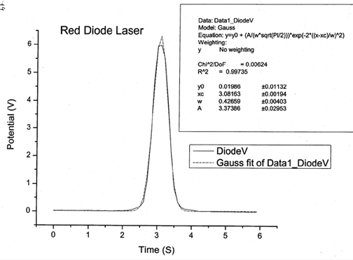 Various methods were explored for moving the second order diffraction grating maximum across a silicon light detector to get a plot of the light distribution with distance. The plots below for the helium-neon laser and red diode laser were obtained by moving the light detector through the diffraction maximum by hand. The shapes were then fit to a gaussian curve.