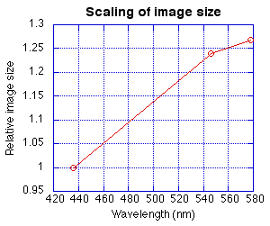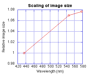 Relative measurements were made of the image size for the three wavelengths of the mercury spectrum, 436, 546, and 578 nm. The measurements were made using the ruler capability in Adobe Photoshop. The relative image sizes for the three wavelengths were plotted with Kaleidograph.