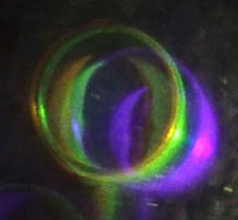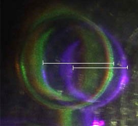 A view of the holographic image formed by a clear mercury vapor lamp was made with a digital video camera. This image is a single frame from the digital video. The diameter of the pipe in the image can be resolved for the green and orange lines, but not for the blue. For the green and blue images, a measurement of well defined features could be made as indicated by the lines on the image. In this way, relative sizes for the three wavelengths could be obtained.