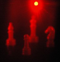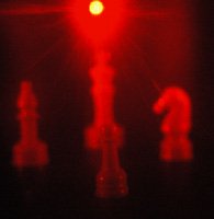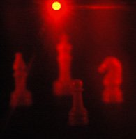 The above image was taken through a transmission hologram. The hologram was illuminated from behind by a helium-neon laser which has been passed through a diverging lens to spread the beam over the hologram.