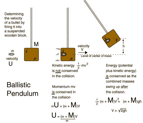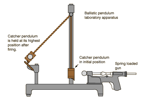 Introduction A collision between two bodies can be elastic or inelastic. In an elastic collision the two bodies rebound with no loss of kinetic energy. In an inelastic collision one or both bodies can be deformed, or they can stick together. Either of these processes absorbs some of the systems kinetic energy. The system can also dissipate kinetic energy in producing sound or heat. Since there are no external forces acting on the system at the time of the collision, linear momentum must be conserved in both cases. ![]() In this lab you will study an inelastic collision using a Blackwood ballistic pendulum. The colliding bodies are a small metal ball, which is fired from a spring loaded gun, and a metal receptacle, or catcher. The receptacle is also the bob of a simple pendulum. Initially the pendulum is at rest. When the gun fires, the ball collides with the pendulum and is trapped in the catcher which then starts to swing. A ratchet and pawl system catches the pendulum at the height of its swing. The best way to understand this experiment is to divide it into three separate events. First, the gun fires and the ball of mass m travels horizontally with initial velocity U In the absence of external forces, the horizontal component of its velocity will not change. The horizontal component of the ball's initial linear momentum is: