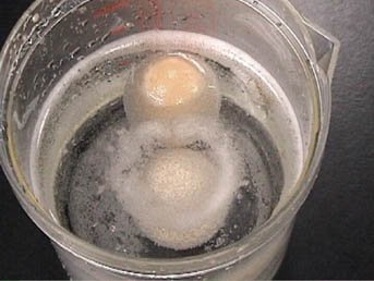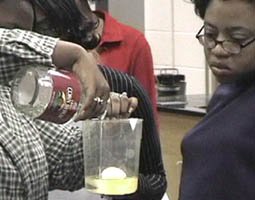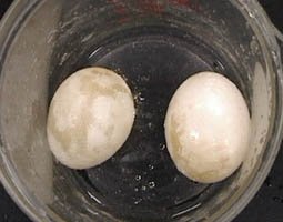 Students made measurements to characterize the eggs (e.g., mass, size, ...) before placing them into solutions of various natures and concentrations. One of the fluids for immersion was syrup, as shown at right above.