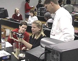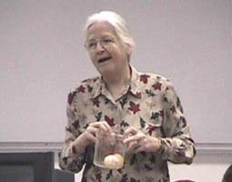 Dr. Olga Jarrett discusses with the class an exercise with eggs which have had their shells removed.