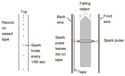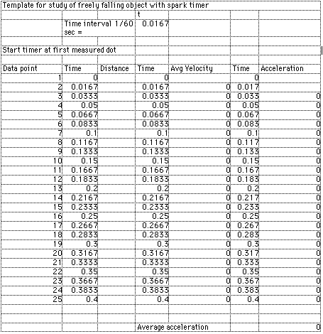 where v2 and v1 are the average velocities over any two successive time intervals t. In this experiment the acceleration of gravity, g, will be determined directly from the motion of a freely falling object using equations 3 and 4. APPARATUS The free-fall apparatus has an electromagnet to hold the object until the record of its fall is to be made. When the switch to the coils of the electromagnet is opened, the magnet can no longer hold the object, and it falls freely into a cup below. A sparking device of known frequency (60 Hz) passes each spark from an outer wire through a conducting metal ring on the object, through a waxed recording tape, and on to a second wire to complete the circuit. The passage of the spark through the waxed tape leaves a small mark or spot on the tape, marking the position of the falling object. With 60 sparks per second, the space between successive marks represents the distance that the object has fallen in 1/60 second. Since the object is accelerating, the distance between marks should increase. You will be provided with a tape from the free-fall apparatus. (A demonstration will be conducted so that you can see how the tape was made.) PROCEDURE 1. Secure the ends of the tape to the table with masking tape. 2. Look at the dots on the tape and note the way the distance between dots increases. You should be able to detect a "misfire" of the apparatus if a dot is missing or if there is an extra mark. If a dot is missing, you need to take that into account in entering your data into the calculation program described below. ![]() 3. Find a dot for a starting point by dropping down at least a centimeter from the first marks so that the falling object will have cleared the magnetic field influence. Label this dot zero (0) and measure the distance from this zero point to each successive dot, measuring as many as possible (at least a dozen). Please note that the distance to be measured is the total distance to each dot from the starting point (zero) and not the distance from the preceding dot. This procedure improves the accuracy of the set of measurements. These distance measurements are critical since they are multiplied by a large number in calculating the acceleration. Measure the distances to the nearest millimeter and then estimate to the nearest tenth of a millimeter. Place the meter stick on its edge so that the scale is next to the paper tape and look perpendicular to the meter stick when taking your reading. You may wish to tape the meter stick down to make sure it doesn't move between measurements. 4. A Spreadsheet is an excellent tool for repetitive calculations and the plotting of data. A template titled FreefallTemplate has been set up, and you can find it under the Apple menu (extreme top left of screen). Open that template and record your measured positions in it. The template should appear similar to the illustration below. Record your position data in the column titled "Distance". The Time columns are set up to reflect the 1/60 second interval of the spark timer. The zeros in the Avg. velocity and Acceleration columns are actually the result of formulas which depend upon the distance data which you will enter. 5. Make a plot of your Distance vs Time by clicking and holding down the mouse button in the upper left box of the first Time column a nd then dragging the mouse diagonally to select a rectangle including your time and distance data. Then release the mouse button and take the mouse up to click on the icon which looks like a magic wand over a bar graph. Then use the mouse to draw a rectangle out beside yur data table where you want the graph to appear. Follow the prompts to create a line graph of your positon data with the first column used as values for the horizontal axis. The slope of the distance vs time graph represents the rate of change of distance, which is the velocity. Why does the slope of the distance curve get steeper? 6. Repeat the process above to plot your Avg. Velocity vs Time. What does this graph tell you? What would the slope of the velocity vs time curve represent if it is likewise a rage of change with respect to time? Describe the slope of the velocity curve and explain its significance. ![]() 7. The values calculated for acceleration are meaningful only as far down as you have position data. Position the mouse on the first acceleration value below the level of your position data and click and hold down the mouse button. Drag the mouse down to the bottom of the column of numbers and release the mouse button to highlight these numbers. Choose Blank from the Edit menu to blank out those values. Then the calculation below should show the average acceleration in cm/s^2. (You can plot these acceleration values if you wish, but they generally swing pretty wildly because any position measurement errors are greatly magnified in the acceleration calculation.) Graphs of position and velocity represent one good way to analyze motion, and the analysis of straight line, constant acceleration motion such as freefall provides an instructive example. |