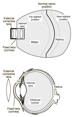 II. Investigation of image formation by the eye. The figure shows a sketch of the eye model. At the beginning of the experiment the retina should be in the middle, or "normal eye" position. The model should be filled with water to a height which covers the fixed lens of the eye model. This fixed lens of the eye model represents the cornea. In addition to the cornea, the human eye has another internal lens. 1. Place the object light about two meters away from the eye model so that light passes through the eye's lens and falls on the retina. Find a lens to place in the holder inside the water of the eye model which will give you a clear image on the retina. This internal lens in the human eye has a variable focal length and is changed in shape to allow you to change your eye's focus from a distant object to a close one. This change of focus is called "accommodation".