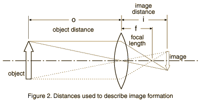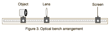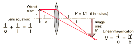 2. What is the average of your focal length measurements, expressed in meters? 3. The lens strength in diopters is defined as S = 1/f(in meters). The unit is 1/m but this unit is commonly called a "diopter". What is the strength of your lens in diopters? Note: Converging lenses are listed as + and diverging lenses as - when diopter numbers are quoted. Prescriptions for eyeglasses are usually expressed in diopters. I. Image formation by a lens; determination of focal length. 4. What is the diopter number of a lens of focal length 0.05 meters? What is the focal length of a +7 diopter lens? 5. Using the average value of your focal length measurements, calculate the image distance i if the object distance is 1.5 x your focal length (e.g, if your measured focal length were 10 cm, you would do the calculation for an object distance of 15 cm). For this arrangement, the image distance and linear magnification of the image are given by ![]() Measure the height of your object and predict the size of the image which would be formed with the object placed as described above. Now make the actual measurements of image distance and image size and compare them with your predictions.