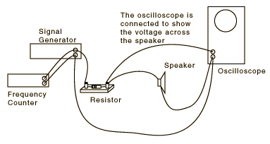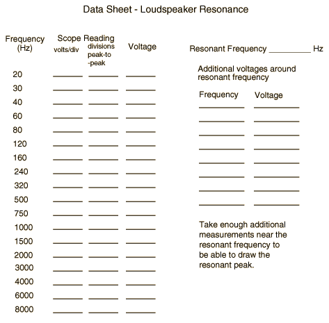 Loudspeaker ResonanceAn open-cone dynamic loudspeaker will generally exhibit a single resonant frequency at which it most readily responds to an electronic signal. The purpose of this experiment is to measure the resonant frequency of a speaker and plot the response curve of the speaker over the audible frequency range. In many applications, resonance is desirable because it provides an enhanced response to a particular frequency, but in loudspeaker design it is in general not desirable. An ideal speaker should respond equally to all audible sound-frequencies so that it will accurately reproduce the sound programming supplied to it. Any change in the relative intensities of the various frequencies present in the sound will change the quality (timbre) of the sound and therefore represents a distortion. Much of the effort in designing a good speaker system is directed toward broadening and smoothing of the open-cone resonance so that the speaker will respond more uniformly to a broad range of frequencies. In this experiment an audio frequency oscillator (signal generator) will be used to drive the speaker and an oscilloscope will be used to measure the voltage supplied to the speaker coil. The connections are shown in the sketch. ![]() A resistor is to be placed in series with the speaker as indicated in the diagram. Its purpose is to maintain a more nearly constant "load" on the signal generator. The speaker impedance is nominally some value like 4 ohms, 8 ohms, etc., but it varies considerably near resonance. The oscilloscope will be used to measure the voltage across the speaker. The voltage will reach its maximum value at the resonant frequency of the speaker. PROCEDURE 1. Wire up the circuit as shown and get a sine wave display on the oscilloscope. The lab instructor will explain the oscilloscope controls. 2. With the signal generator output set to its maximum range, adjust the frequency to 20 Hz using the frequency dial and the multiplier switch. Sweep the frequency up slowly to 1000 Hz, watching the oscilloscope display. When the vertical height (voltage) of the display peaks and then diminishes, you have passed through the resonant frequency. Adjust the oscilloscope control labelled 'volts/cm' until the vertical height nearly fills the screen. Be sure you know what scale factor you are using on this control. Record the voltage (height in cm times the scale factor in volts/cm) and the resonant frequency. 3. Reset the frequency to 20 Hz and record the voltage from the oscilloscope. (Do not adjust any of the controls on the signal generator except the frequency for the remainder of the experiment). 4. Take voltage readings at one-half octave intervals over the frequency range 20 - 8,000 Hz as outlined on the data sheet. Take additional measurements at several frequencies near the resonant frequency, so that the behavior near resonance can be followed more closely. 5. On the semi-log paper provided, plot your measured frequency and voltage data. The frequency is to be placed on the logarithmic axis. On the other axis, choose a scale such that the voltage at resonance will nearly reach the top of the scale. Draw small circles around your plotted points and then draw a smooth curve through your points to produce a frequency response for your speaker. Equipment: Loudspeaker Resonance