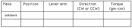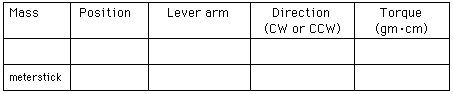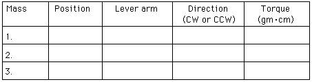 Procedure: I. Balancing with multiple torques 1. Balance the meter stick in a horizontal position on its knife-edge supports with no weights attached. Record the point on the stick at with it balances. 2. Suspend three masses from the meter stick as indicated in the sketch and move them until you balance the meter stick. Record the mass values and their positions. 3. Determine the lever arm associated with each mass and record the values in the data table below. Compute the mass times the lever arm for each mass. (The torque, strictly speaking, is the weight times the lever arm. But the mass times the lever arm differs only by the constant g, the acceleration of gravity, so for the balance condition it serves the same purpose.) ![]() 4. Compare the clockwise and counterclockwise torques. How much does the net torque differ from the theoretical value of zero? Data: Pivot point on meter stick _____________ ![]() II. Determination of unknown mass 1. After removing the other masses, suspend the supplied unknown mass from a convenient point on one side of the meter stick. Use one of your known masses to produce rotational equilibrium and compute the unknown mass. Then mass the unknown on the pan balance and compare your results. ![]() Data: Unknown mass (calculated from above) _____________ Unknown mass (from pan balance) ______________ difference _________________ III. Determination of meter stick mass 1. Move the meter stick in its support so that the new pivot point is 10 cm away from its balance point. Restore balance by hanging a known mass from one side of the meter stick. Use the equilibrium condition to determine the meter stick mass and check your result by massing the stick on the pan balance. ![]() Data: Meter stick mass calculated ________________ pan balance _______________ difference _________________ |