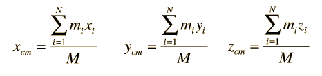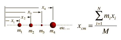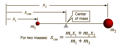 Center of Mass for ParticlesThe center of mass is the point at which all the mass can be considered to be "concentrated" for the purpose for the purpose of calculating the "first moment", i.e., mass times distance. For two masses this distance is calculated from ![]() For the more general collection of N particles this becomes ![]() and when extended to three dimensions: ![]() This approach applies to diccrete masses even if they are not point masses if the position xi is taken to be the position of the center of mass of the ith mass. It also points the way toward the calculation of the center of mass of an extended object. |