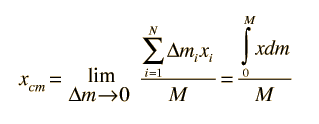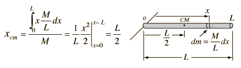 Center of Mass: ContinuousFor a continuous distribution of mass, the expression for the center of mass of a collection of particles : ![]() becomes an infinite sum and is expressed in the form of an integral ![]() For the case of a uniform rod this becomes ![]() This example of a uniform rod previews some common features about the process of finding the center of mass of a continuous body. Continuous mass distributions require calculus methods involving an integral over the mass of the object. Such integrals are typically transformed into spatial integrals by relating the mass to a distance, as with the linear density M/L of the rod. Exploiting symmetry can give much information: e.g., the center of mass will be on any rotational symmetry axis. The use of symmetry would tell you that the center of mass is at the geometric center of the rod without calculation. |