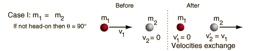Elastic Collision, Equal MassesFor a head-on collision with a stationary object of equal mass, the projectile will come to rest and the target will move off with equal velocity, like a head-on shot with the cue ball on a pool table. This may be generalized to say that for a head-on elastic collision of equal masses, the velocities will always exchange.![]()