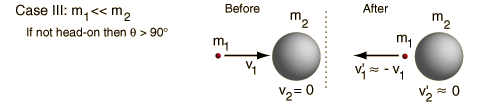 Elastic Collision, Massive ProjectileIn a head-on elastic collision where the projectile is much more massive than the target, the velocity of the target particle after the collision will be about twice that of the projectile and the projectile velocity will be essentially unchanged.![]() For non-head-on collisions, the angle between projectile and target is always less than 90 degrees. This was important in the analysis of the original Rutherford scattering experiment. This case implies that a train moving at 60 miles/hr which hits a small rock on the track could send that rock forward at 120 miles/hr if the collision were head-on and perfectly elastic. It also implies that if the speed of the head of your golf club is 110 miles/hr, the limiting speed on the golf ball off the tee is 220 miles/hr in the ideal case. That is, the limiting speed of the ball depends strictly on the clubhead speed, and not on how much muscle power you put into the swing.