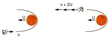 Gravity-Assist or Slingshot OrbitPlanetary exploration vessels like Voyager I and Voyager II made use of propulsion maneuvers which gained energy from the planets and moons they passed. Such maneuvers are really elastic collisions where the objects involved never hit each other but are affected by gravity as they approach. An extreme case of such a propulsion maneuver is like the double ball drop. A famous example of the use of such maneuvers is the exploration of Comet G-Z. The Voyager missions also made several energy-boosting flybys of planets on their paths through the solar system. The spacecraft Mariner 10 made several slingshot maneuvers in its exploration of Venus and Mercury.![]()