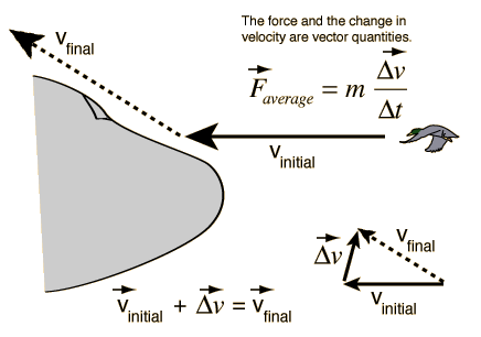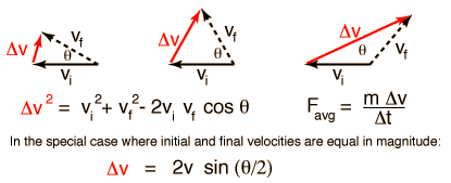 Force of Glancing BlowThe force of collision between an airliner and a duck can be diminished greatly if the duck bounces off. The impact force is given by: ![]() The impact force is reduced by the fact that the change in velocity is much less for the glancing blow. The vector addition which gives the final velocity shows that for a small angle deflection, the velocity change is small. The change in velocity may be calculated using the law of cosines. In the elastic case where initial and final speeds are equal, the half-angle formula may be used to obtain a simplified expression.