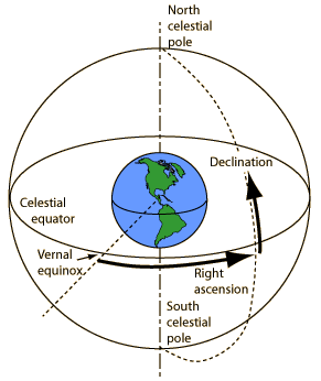 Right ascension is a celestial longitude measured in the direction of the Earth's rotation. Since that rotation makes a complete circle in 24 hours, the notation adopted for right ascension was in terms of hours and minutes with 24 hours representing the full circle. Declination is expressed as an angle with respect to the celestial equator. For example, the celestial coordinates of the star Betelgeuse in the constellation Orion are right ascension = 5 hours 52 minutes and the declination is 7 degrees 24 minutes. A declination south of the celestial equator is given a negative sign. |