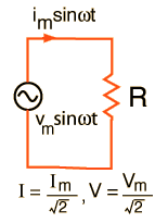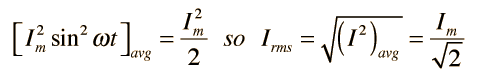 RMS and Effective ValuesCircuit currents and voltages in AC circuits are generally stated as root-mean-square or rms values rather than by quoting the maximum values. The root-mean-square for a current is defined by ![]() That is, you take the square of the current and average it, then take the square root. When this process is carried out for a sinusoidal current ![]() Since the AC voltage is also sinusoidal, the form of the rms voltage is the same. These rms values are just the effective value needed in the expression for average power to put the AC power in the same form as the expression for DC power in a resistor. In a resistor where the power factor is equal to 1: ![]() Since the voltage and current are both sinusoidal, the power expression can be expressed in terms of the squares of sine or cosine functions, and the average of a sine or cosine squared over a whole period is = 1/2.