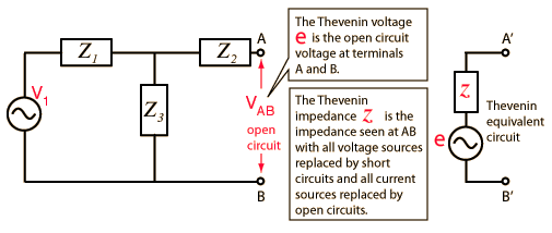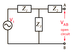 To replace a network by its Thevenin equivalent, compute the Thevenin voltage: the output of the voltage divider formed by Z1 and Z3 . The Thevenin impedance is the impedance looking back from AB with V1 replaced by a short circuit and is therefore a a series-parallel combination.