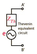 Any combination of sinusoidal AC sources and impedances with two terminals can be replaced by a single voltage source e and a single series impedance z. The value of e is the open circuit voltage at the terminals, and the value of z is e divided by the current with the terminals short circuited. In this case, that impedance evaluation involves a series-parallel combination.