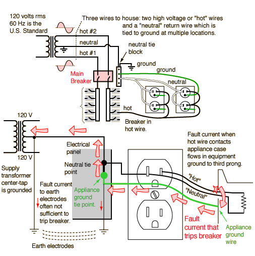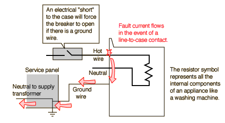 In the event of an electrical fault which brings dangerous high voltage to the case of an appliance, you want the circuit breaker to trip immediately to remove the hazard. If the case is grounded, a high current should flow in the appliance ground wire and trip the breaker. That's not quite as simple as it sounds - tying the ground wire to a ground electrode driven into the earth is not generally sufficient to trip the breaker, which was surprising to me. The U.S. National Electric Code Article 250 requires that the ground wires be tied back to the electrical neutral at the service panel. So in a line-to-case fault, the fault current flows through the appliance ground wire to the service panel where it joins the neutral path, flowing through the main neutral back to the center-tap of the service transformer. It then becomes part of the overall flow, driven by the service transformer as the electrical "pump", which will produce a high enough fault current to trip the breaker. In the electrical industry, this process of tying the ground wire back to the neutral of the transformer is called "bonding", and the bottom line is that for electrical safety you need to be both grounded and bonded.