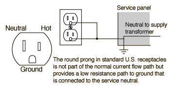 The term "ground" refers to a connection to the earth, which acts as a reservoir of charge. A ground wire provides a conducting path to the earth which is independent of the normal current-carrying path in an electrical appliance. As a practical matter in household electric circuits, it is connected to the electrical neutral at the service panel to gaurantee a low enough resistance path to trip the circuit breaker in case of an electrical fault (see illustration below). Attached to the case of an appliance, it holds the voltage of the case at ground potential (usually taken as the zero of voltage). This protects against electric shock. The ground wire and a fuse or breaker are the standard safety devices used with standard electric circuits.