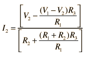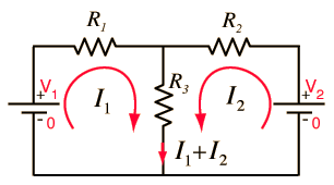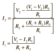 the current law. This approach requires two simultaneous equations formed by applying the voltage law to both loops. Taking the loops in the directions shown means that the sum of the currents flows through the middle resistor. Putting polarities on each component helps to keep the signs straight. The two loop equations are:
