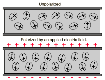 When a dielectric is placed between charged plates, the polarization of the medium produces an electric field opposing the field of the charges on the plate. The dielectric constant k is defined to reflect the amount of reduction of effective electric field as shown below. The permittivity is a characteristic of space, and the relative permittivity or "dielectric constant" is a way to characterize the reduction in effective field because of the polarization of the dielectric. The capacitance of the parallel plate arrangement is increased by factor k.