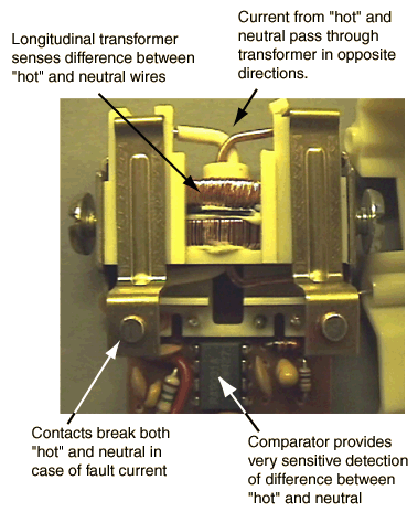 Ground fault interrupters are designed to protect from electrical shock by interrupting a household circuit when there is a difference in the currents in the "hot" and neutral wires. Such a difference indicates that an abnormal diversion of current from the "hot" wire is occuring. Such a current might be flowing in the ground wire, such as a leakage current from a motor or from capacitors. More importantly, that current diversion may be occuring because a person has come into contact with the "hot" wire and is being shocked. When a circuit is functioning normally, all the return current from an appliance flows through the neutral wire, so the presence of a difference between "hot" and neutral currents represents a malfunction which in some circumstances could produce a dangerous or even lethal shock hazard.