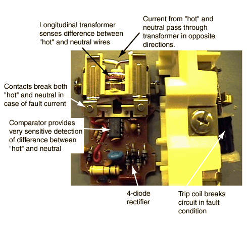 Ground Fault InterrupterGround fault interrupters are designed to protect from electrical shock by interrupting a household circuit when there is a difference in the currents in the "hot" and neutral wires. Such a difference indicates that an abnormal diversion of current from the "hot" wire is occuring. Such a current might be flowing in the ground wire, such as a leakage current from a motor or from capacitors. More importantly, that current diversion may be occurring because a person has come into contact with the "hot" wire and is being shocked. When a circuit is functioning normally, all the return current from an appliance flows through the neutral wire, so the presence of a difference between "hot" and neutral currents represents a malfunction which in some circumstances could produce a dangerous or even lethal shock hazard. ![]() The "hot" and neutral wires are passed through the sensing coil so that the currents in the two wires at any instant are traveling in opposite directions, giving a net zero current in the coil if the two currents are exactly equal. Since a current-carrying wire produces an AC magnetic field external to the wire, a non-zero current would induce a voltage in the sensing coil. The sensing coil is wound longitudinally to capture more of the wire's magnetic field and therefore be a more sensitive net current detector. Even so, the difference that it is supposed to detect is quite small. The GFI is designed to trip when there is more than 5 milliamperes of leakage current out of the normal pathway. The neutral return would then have 5 mA less current than the "hot" wire, but that might be out of a 20A load. So the circuit would have to detect a 0.025% deviation from 20A return current. Fortunately, comparator circuits such as an op-amp comparator are quite capable of detecting such differences. The voltage in the sensor coil is rectified and applied to the input of the sensitive comparator. The comparator activates a trip coil which opens both the "hot" and neutral wires. If all circuits were wired with correct polarity, opening the "hot" wire would be sufficient, but since it is not uncommon for them to be accidentally wired backward, it is prudent to interrupt both leads. It is common household practice to wire several receptacles on a given circuit. A single GFI at the circuit panel will protect the entire collection of receptacles since a difference between "hot" and neutral current at any one of them will cause a difference at the GFI through which the current to the entire circuit passes. Because of the great sensitivity of the detection of current differences, GFIs are prone to nuisance tripping in certain applications. A rather common practice in some areas is to have a freezer on the carport, and carport receptacles are sometimes wired with GFIs. Under moist conditions you can sometimes get enough leakage current to trip the GFI, and persons come back to find their freezer thawed out. A necessary safety precaution in bathrooms and near pools, they are sometimes quite troublesome in outdoor applications where reliable power is needed. John de Armond has a good discussion of other circumstances which lead to nuisance tripping, particularly with campers and recreational vehicles.