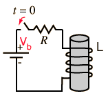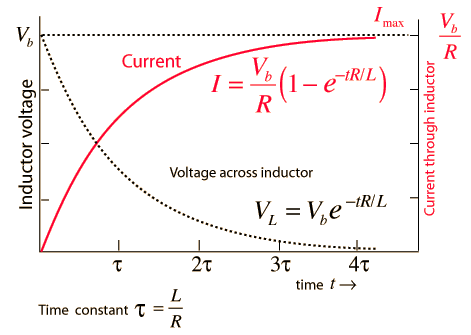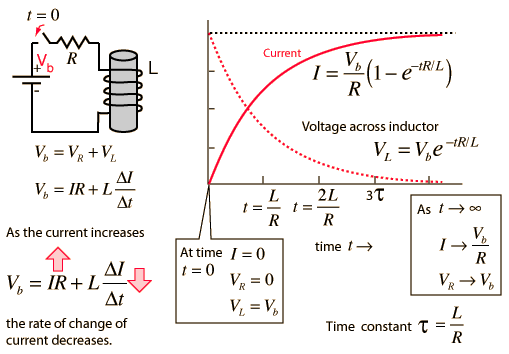 When a battery is connected to a series resistor and inductor, the inductor resists the change in current and the current therefore builds up slowly. Acting in accordance with Faraday's law and Lenz's law, the amount of impedance to the buildup of current is proportional to the rate of change of the current. That is, the faster you try to make it change, the more it resists. The current builds up toward the value it would have with the resistor alone because once the current is no longer changing, the inductor offers no impedance. The rate of this buildup is characterized by the time constant L/R . Establishing a current in an inductor stores energy in the magnetic field formed by the coils of the inductor.