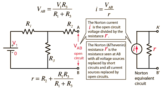 Norton Example Replacing a network by its Norton equivalent can simplify the analysis of a complex circuit. In this example, the Norton current is obtained from the open circuit voltage (the Thevenin voltage) divided by the resistance r. This resistance is the same as the Thevenin resistance, the resistance looking back from AB with V1 replaced by a short circuit.