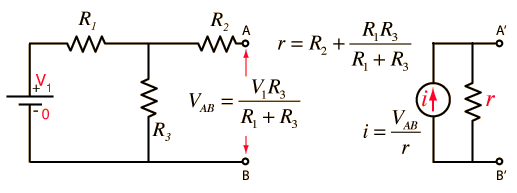 Norton CurrentThe value i for the current used in Norton's Theorem is found by determining the open circuit voltage at the terminals AB and dividing it by the Norton resistance r. ![]()