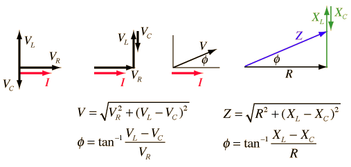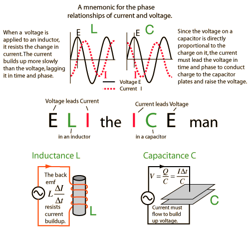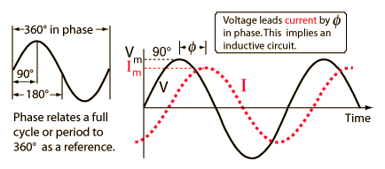 PhaseWhen capacitors or inductors are involved in an AC circuit, the current and voltage do not peak at the same time. The fraction of a period difference between the peaks expressed in degrees is said to be the phase difference. The phase difference is <= 90 degrees. It is customary to use the angle by which the voltage leads the current. This leads to a positive phase for inductive circuits since current lags the voltage in an inductive circuit. The phase is negative for a capacitive circuit since the current leads the voltage. The useful mnemonic ELI the ICE man helps to remember the sign of the phase. The phase relation is often depicted graphically in a phasor diagram. ![]()