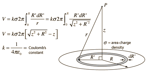 Potential for Disc of ChargeThe potential of a disc of charge can be found by superposing the point charge potentials of infinitesmal charge elements. It is an example of a continuous charge distribution. The evaluation of the potential can be facilitated by summing the potentials of charged rings. The integral over the charged disc takes the form: ![]()