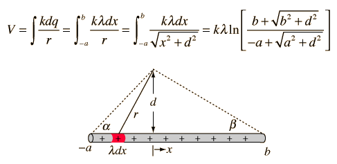 Potential of Line ChargeThe potential of a line of charge can be found by superposing the point charge potentials of infinitesmal charge elements. It is an example of a continuous charge distribution. ![]()