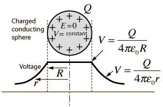 Since the electric field is equal to the rate of change of potential, this implies that the voltage inside a conductor at equilibrium is constrained to be constant at the value it reaches at the surface of the conductor. A good example is the charged conducting sphere, but the principle applies to all conductors at equilibrium.