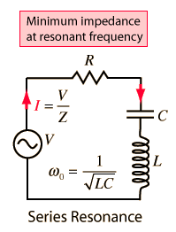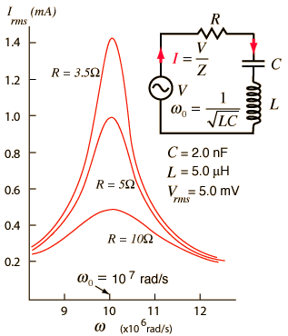 The selectivity of a circuit is dependent upon the amount of resistance in the circuit. The variations on a series resonant circuit at right follow an example in Serway & Beichner. The smaller the resistance, the higher the "Q" for given values of L and C. The parallel resonant circuit is more commonly used in electronics, but the algebra necessary to characterize the resonance is much more involved. |  |