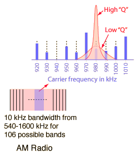 | An example of the application of resonant circuits is the selection of AM radio stations by the radio receiver. The selectivity of the tuning must be high enough to discriminate strongly against stations above and below in carrier frequency, but not so high as to discriminate against the "sidebands" created by the imposition of the signal by amplitude modulation. |