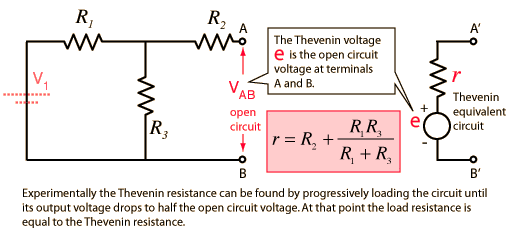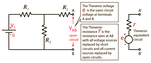 Thevenin's TheoremAny combination of batteries and resistances with two terminals can be replaced by a single voltage source e and a single series resistor r. The value of e is the open circuit voltage at the terminals, and the value of r is e divided by the current with the terminals short circuited. ![]()