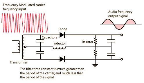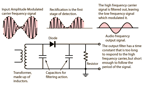 The modulated AM carrier wave is received by the antenna of the radio receiver and is rectified by the action of a detector diode. Then the rectified signal passes through a low-pass filter for which the time constant is too long to respond to the high frequency of the AM carrier wave. AM carriers are in the range 600 to 1400 kHz. The signal frequency which modulates it is much lower, 0.02 to 5 kHz, and it can pass through the filter.