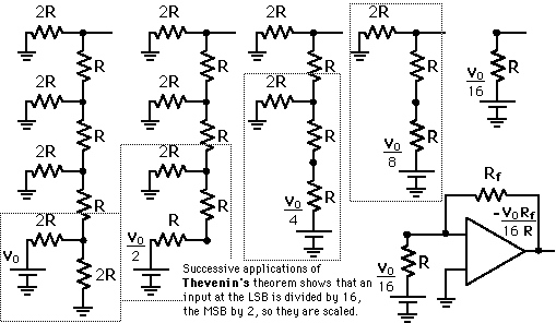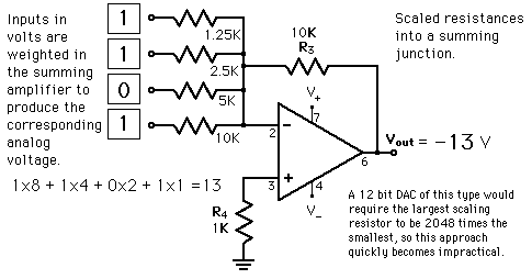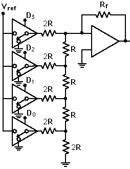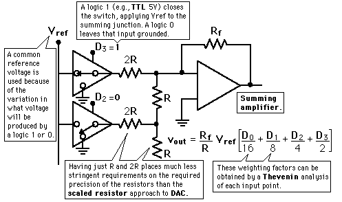 When data is in binary form, the 0's and 1's may be of several forms such as the TTL form where the logic zero may be a value up to 0.8 volts and the 1 may be a voltage from 2 to 5 volts. The data can be converted to clean digital form using gates which are designed to be on or off depending on the value of the incoming signal. Data in clean binary digital form can be converted to an analog form by using a summing amplifier. For example, a simple 4-bit D/A converter can be made with a four-input summing amplifier. More practical is the R-2R Network DAC.