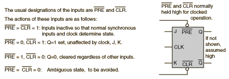 Asynchronous Inputs to Flip-FlopsThe ordinary data transfer uses of flip-flops make use of inputs which are called "control" or "synchronous" inputs. Most often, the output changes from the flip-flops occur when data is applied to these inputs synchronously with a clock pulse. There is another set of inputs called the asynchronous set and clear inputs which will change the state of the flip-flop regardless of what is going on at the other inputs - they are override inputs which can force a given state onto the flip-flop. They are used in asynchronous data transfer. ![]()