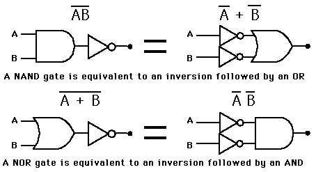 DeMorgan ApplicationsDeMorgan's Theorem is useful in the implementation of the basic gate operations with alternative gates, particularly with NAND and NOR gates which are readily available in IC form.