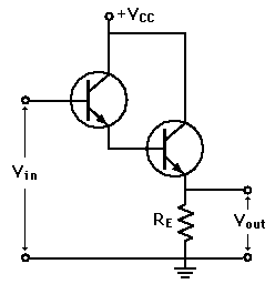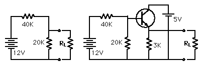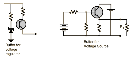 An emitter follower can serve as a buffer for a voltage source. The voltage divider at left is a poor voltage source because it is so strongly affected by the value of the load resistor. The same voltage divider with the transistor buffer at right will supply power to keep the voltage constant over its range of operation.