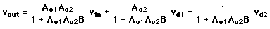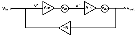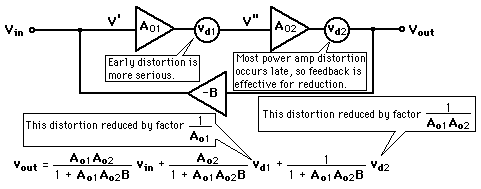 The use of negative feedback can discriminate against sources of noise or distortion within an amplifier. Considering a two-stage amplifer (after Simpson) with sources of distortion vd1 and vd2 inside the feedback loop.