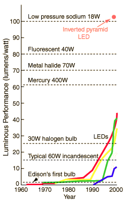 Craford, et al. make the case that LED lighting is making great strides in power and efficiency and will play a more major role in general lighting. Some types last 100,000 hours, compared to about 1000 hours for an incandescent bulb. Now that blue LEDs have become a reality, white light LEDs can be produced by combining the red, green and blue chips in a single device.