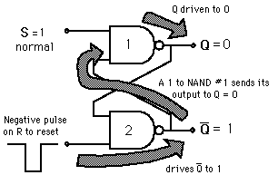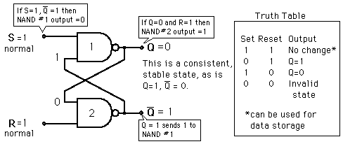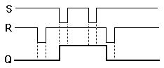 The time sequence at right shows the conditions under which the set and reset inputs cause a state change, and when they don't.