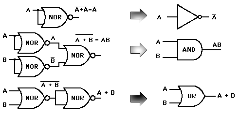NOR Gate OperationsThe NOR gate is called a universal gate because combinations of it can be used to accomplish all the basic functions. ![]()