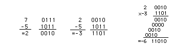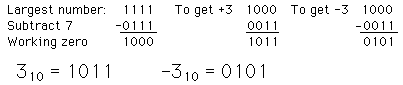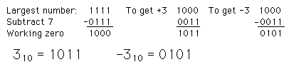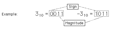"Sign Magnitude" RepresentationThe most significant bit of a binary number can be used to represent the sign of the number, using the other bits to represent its magnitude. It is a natural kind of representation of signed integers, but is not used much because it is awkward for doing arithmetic compared to a system like 2's complement. There are also two zeros, since + and - zero will have a different code. ![]()