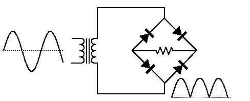 Bridge Rectifier, RC FilterA bridge rectifier makes use of four diodes in a bridge arrangement to achieve full-wave rectification. This is a widely used configuration, both with individual diodes wired as shown and with single component bridges where the diode bridge is wired internally. ![]()